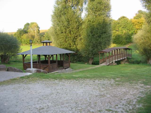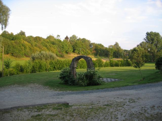 Großzügiger Vorplatz mit Riesenschachbrett und Wiese zum Zelten.
